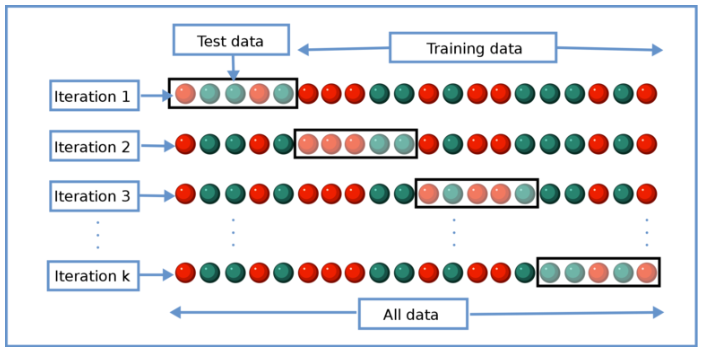 데이터를 train data (학습데이터)와 test data(테스트 데이터)로 분리 할 때, k=4라면 4등분을 균등분할 합니다.