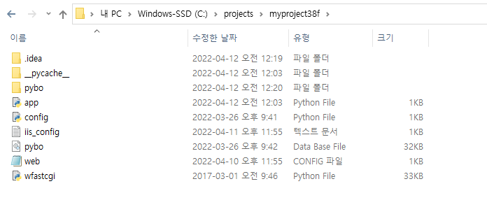 pip install wfastcgi 하시면 라이브러리 폴더에 wfastcgi.py 파일이 생기는데 이 폴더를 실제 소스가 있는 폴더로 복사를 해줍니다. 저의 개발 소스가 담겨있는 최 상위 폴더는 projects/myproject38f인데 이곳에 wfastcgi.py 파일을 복사,붙여넣기 합니다. (아래 폴더를 보시면 파일이 보이시죠??)