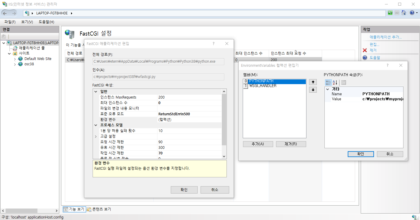 실행파일옵션 : C:\Users\etern\AppData\Local\Programs\Python\Python38\python.exe|c:\projects\myproject38f\wfastcgi.py